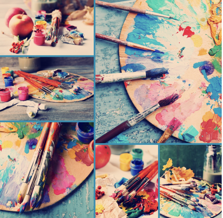 affiche représentant tout le matériel artistique pinceaux, crayons pour créer