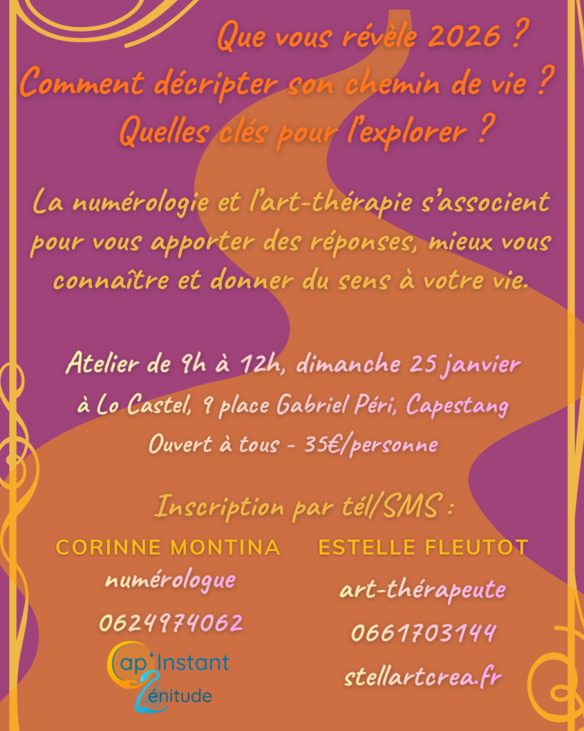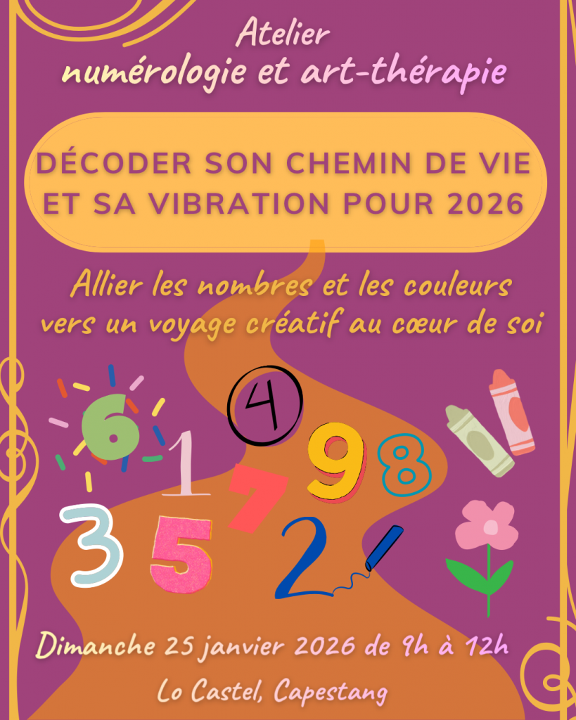 En janvier 2026, Corinne et Estelle vous proposent un rendez-vous unique pour débuter l’année avec clarté, créativité et profondeur. ✨ Cet atelier de numérologie et d’art-thérapie vous invite à explorer votre chemin de vie, vos vibrations personnelles et l’énergie de 2026.