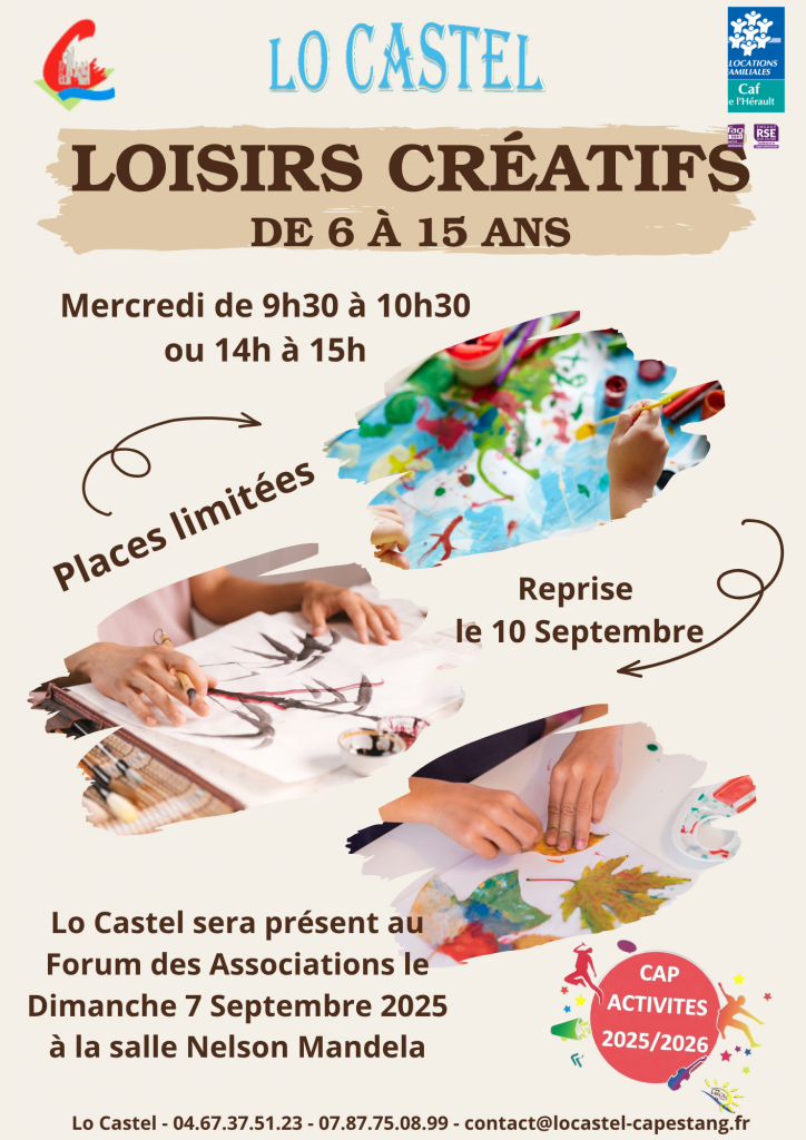 A partir du 10 septembre 2025, j’animerai un atelier de loisirs créatifs tous les mercredis de 14h à 15h à Lo Castel à Capestang. Lors de cet atelier hebdomadaire, les enfants réaliseront des créations arts plastiques utilisant plusieurs techniques artistiques : la sculpture, le modelage, la peinture, le dessin, le collage, le découpage, la couture, le scrapbooking, le recyclage, etc.
