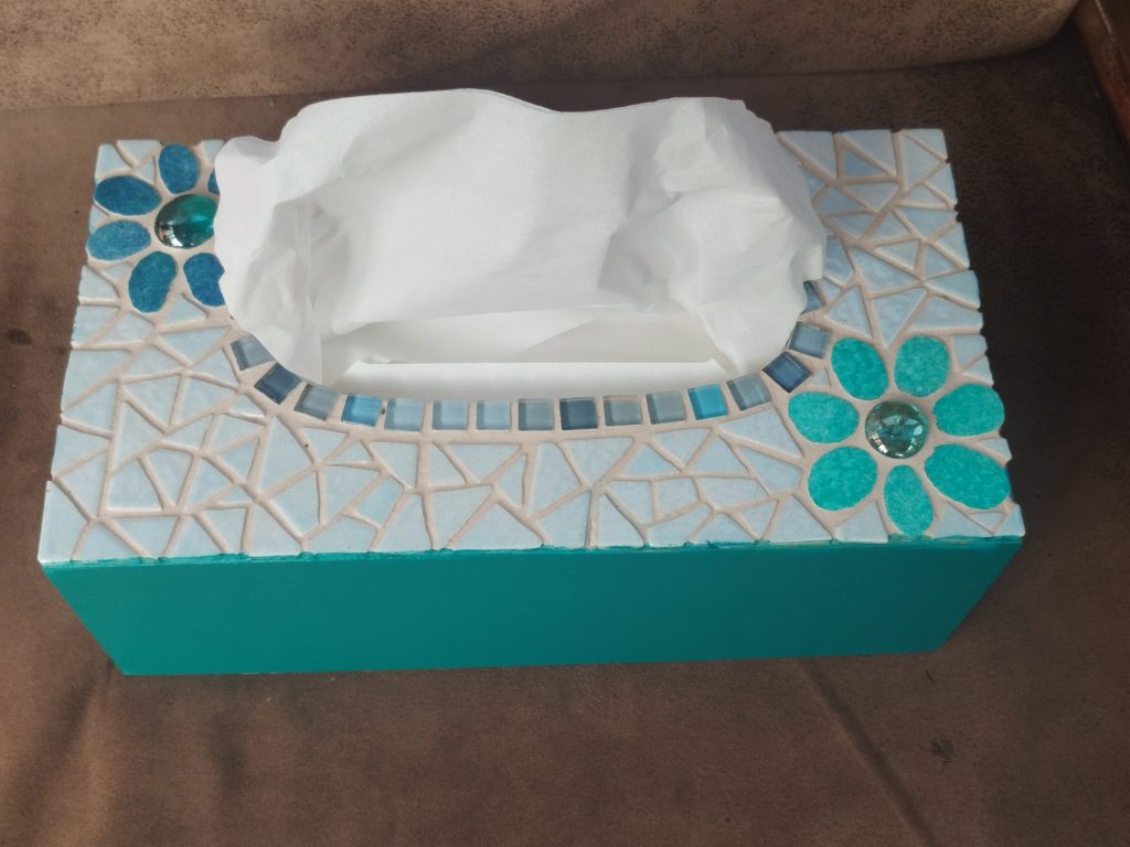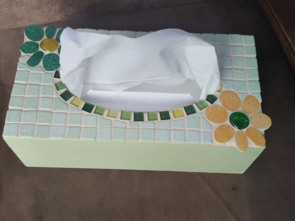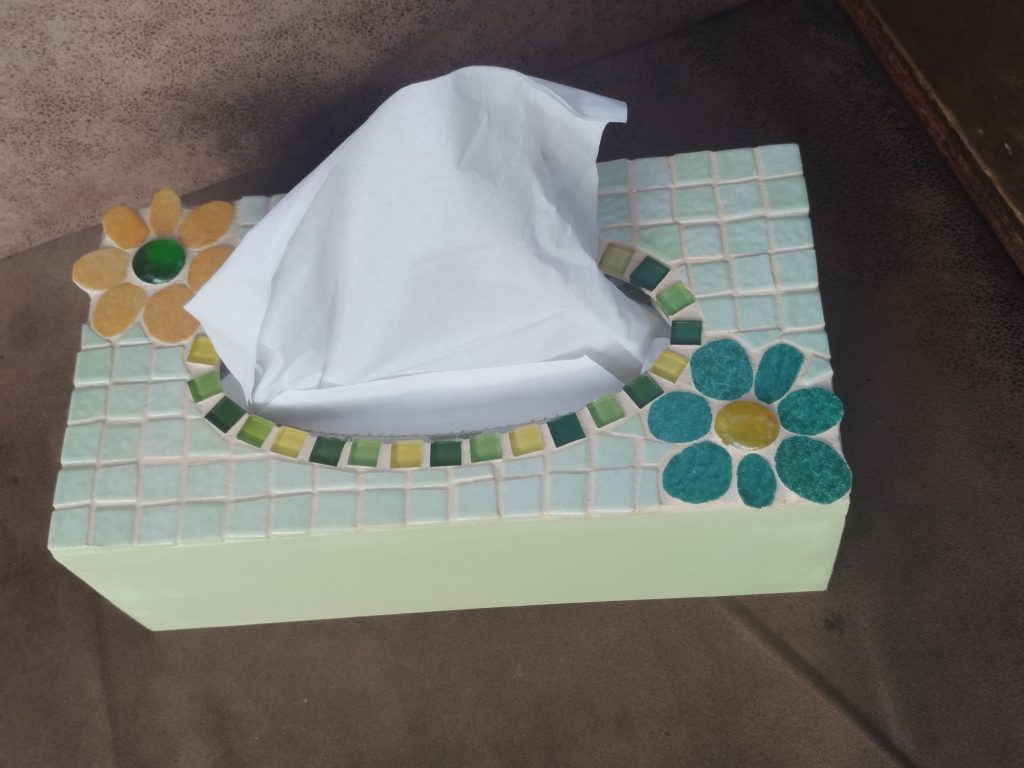 Boîtes à mouchoirs de différents coloris et différents motifs floraux réalisées avec des émaux de Briare.