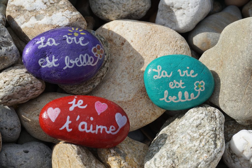 Galets avec mantra et/ou phrase positive. Galets peints à la main puis vernis. Différentes tailles, différents motifs, de l’abstrait, des mots doux et de la fantaisie !