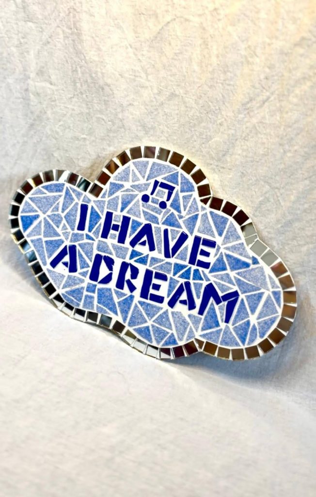 Objet décoratif en forme de nuage réalisé avec des émaux de Briare et des miroirs. Motif message : I have a dream (= J’ai un rêve).