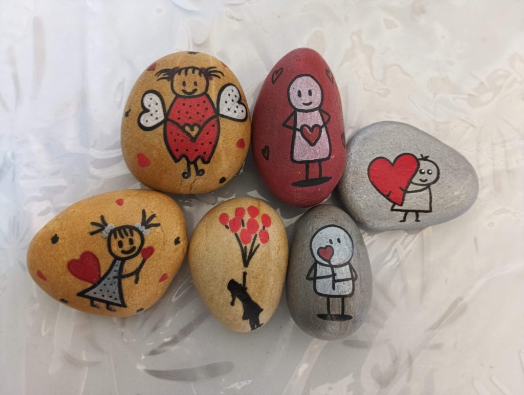Galets avec des doux messages attentionnés. Galets peints à la main puis vernis. Différentes tailles, différents motifs de personnages, des mots doux et beaucoup d’amour !